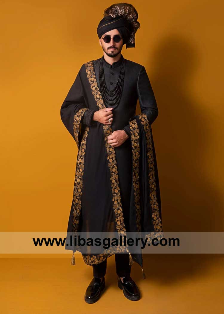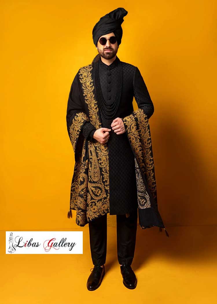 Discover stylish black groom sherwani designs by Libas Gallery. Ideal for Pakistani weddings with modern cuts, good fabric, and beautiful details. Dress to impress dashing collection of black sherwanis for groom, the perfect colour to pull off a one-of-kind and classy look. you can wear a black sherwani on your wedding day. latest Fashions offers top picks that perfectly blend style with tradition.Discover Dulha Nikah Sherwani: Timeless Tradition and Comfort for Special Occasions. Explore the Best in black sherwani for groom