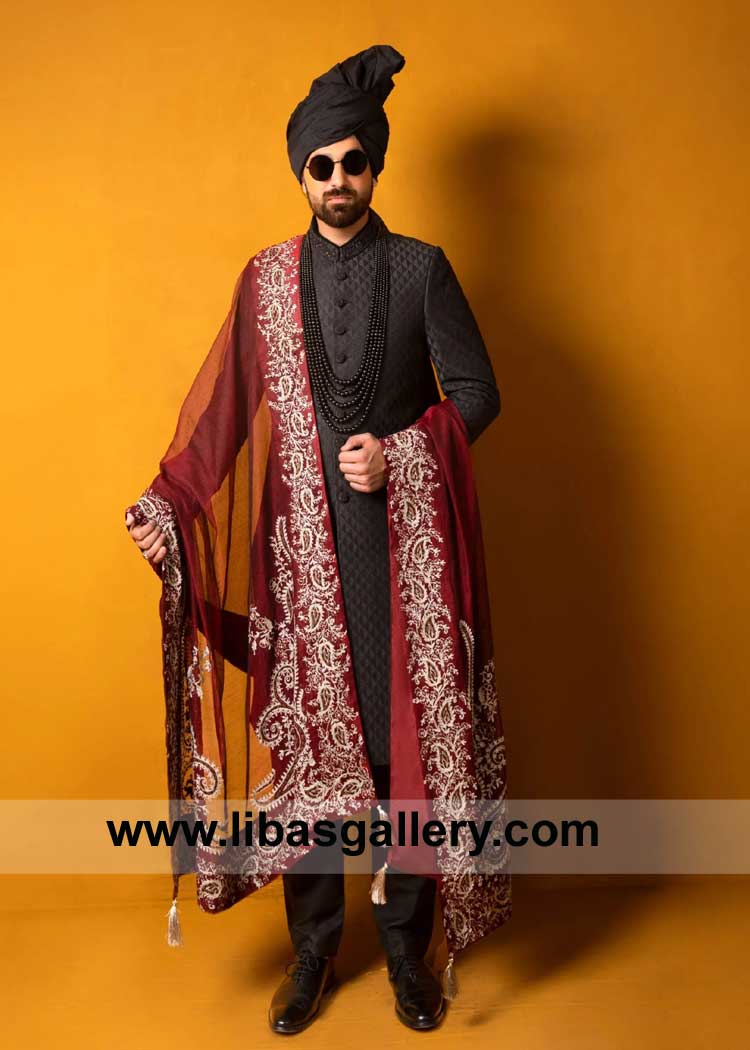 Discover timeless elegance with our Black Sherwani for Groom. Embrace the allure of black as it meets the artistry of renowned Pakistani craftsmanship.