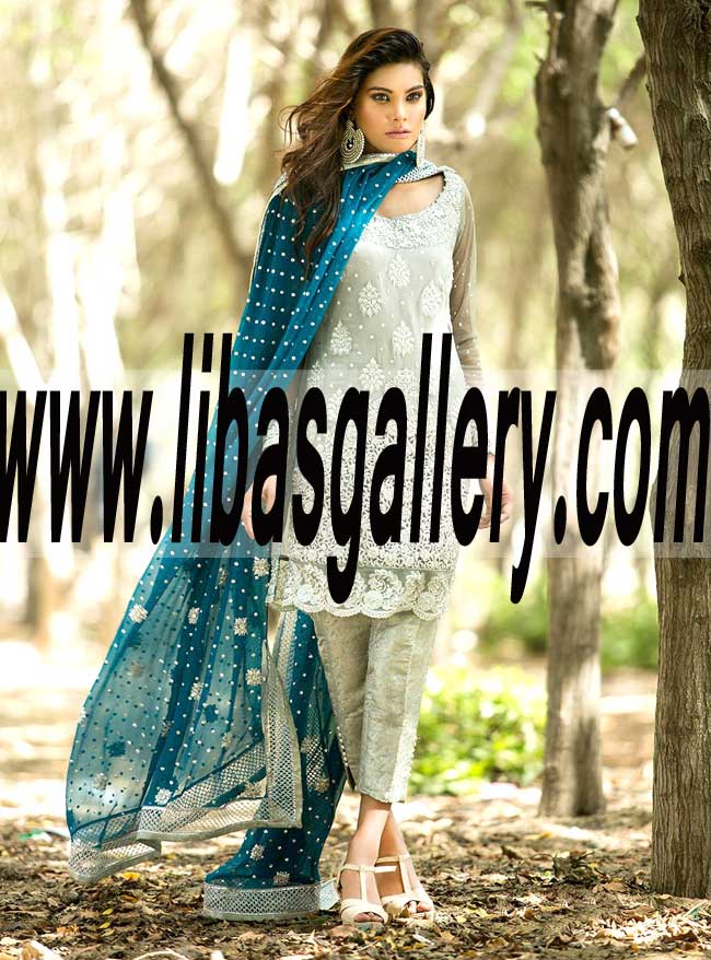 Voguish Pakistani Designer SILVER AND TEAL DRESS for Evening and Party