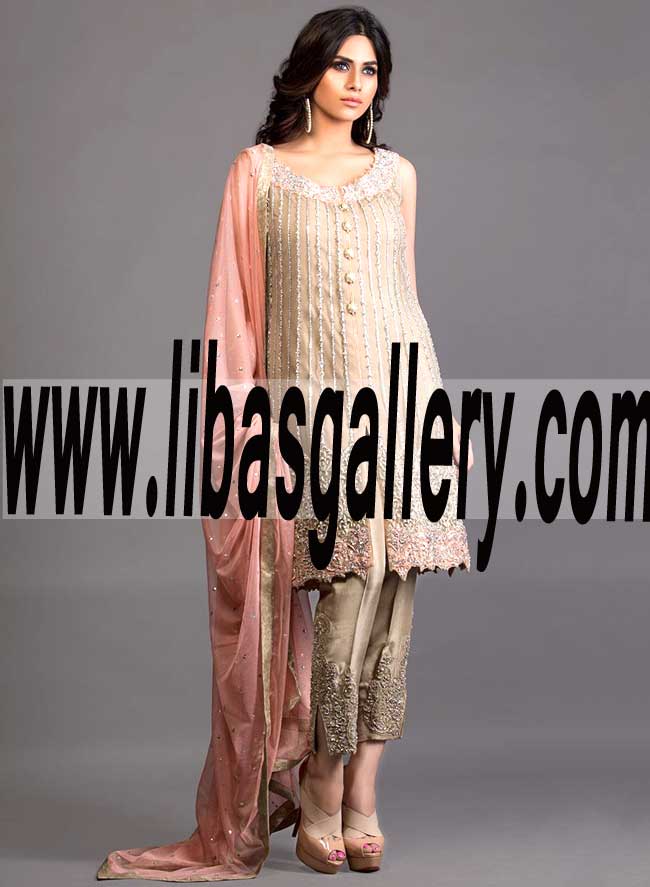 Fashionable BEIGE FRONT OPEN Prominent EMBELLISHED ENSEMBLE for Party and Formal Events