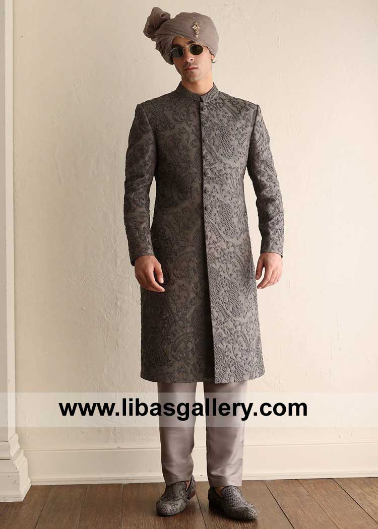 Deep Taupe elegant Groom Wedding Sherwani with intricate embellishment