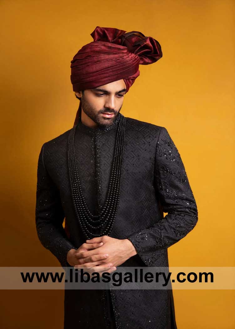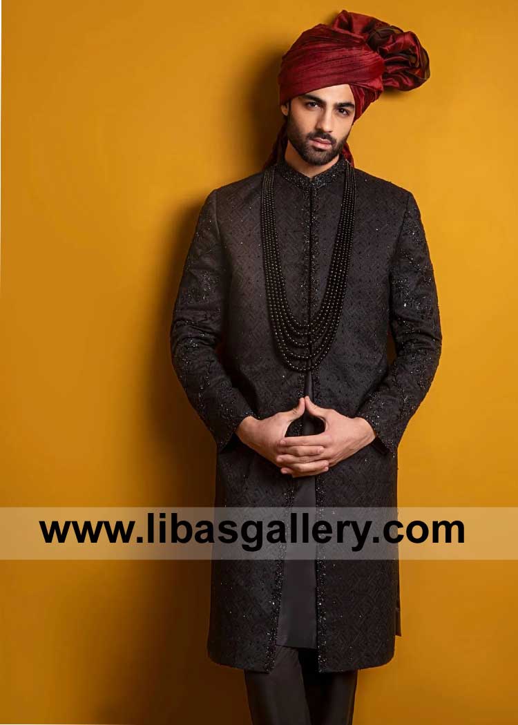 Heavy Black Sherwani intricate Chikankari embroidery and dazzling crystal embellishments