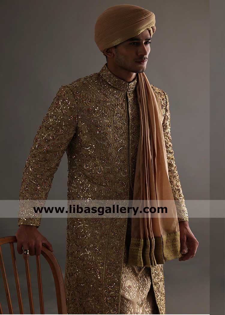 Regal Gold hand Embellished Men Nikah Wedding Sherwani