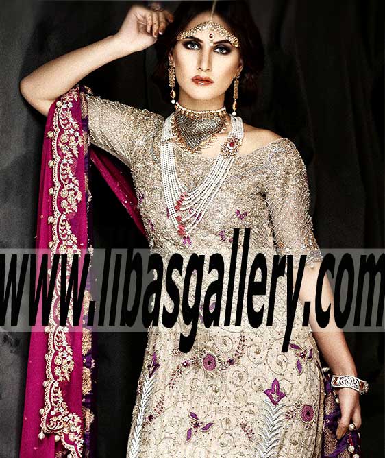Sumptuous Almond Color Floor Length Train Lehenga Wedding Dress