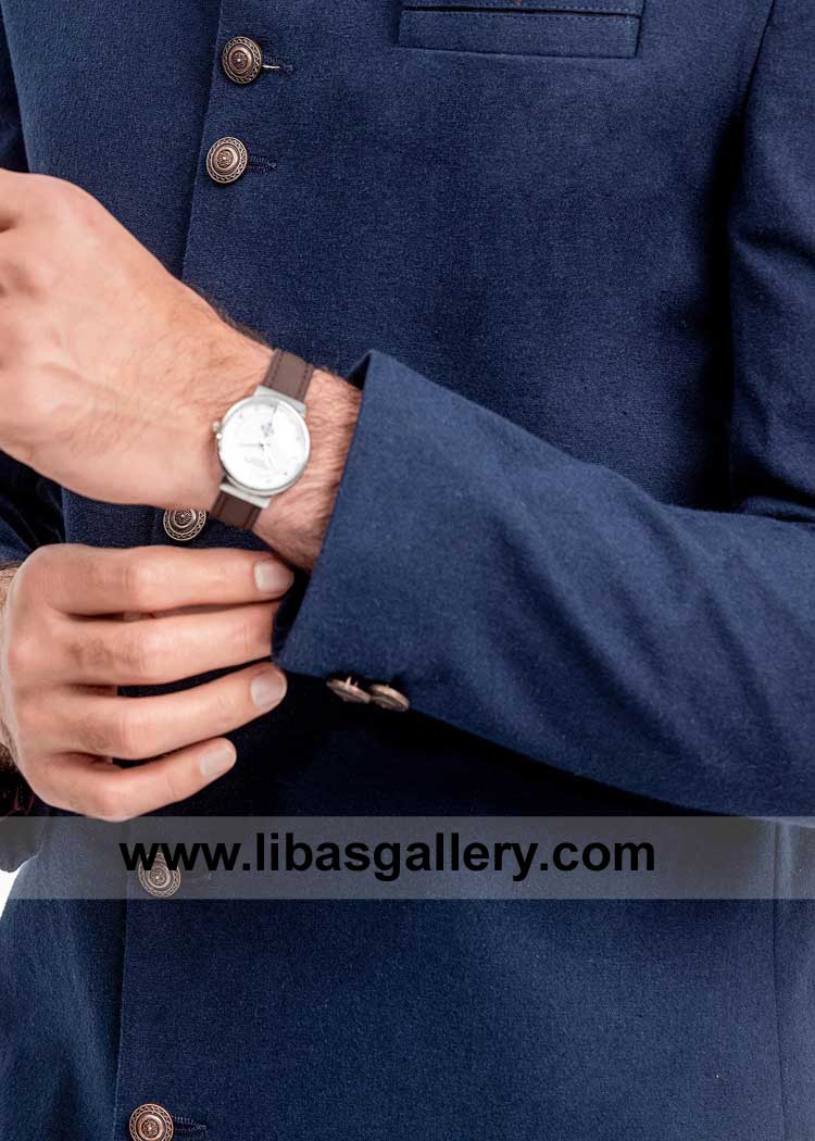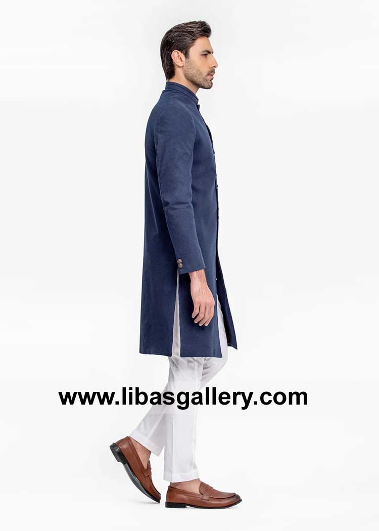 Dark Navy Blue Suiting Fabric Classic Men Sherwani Style