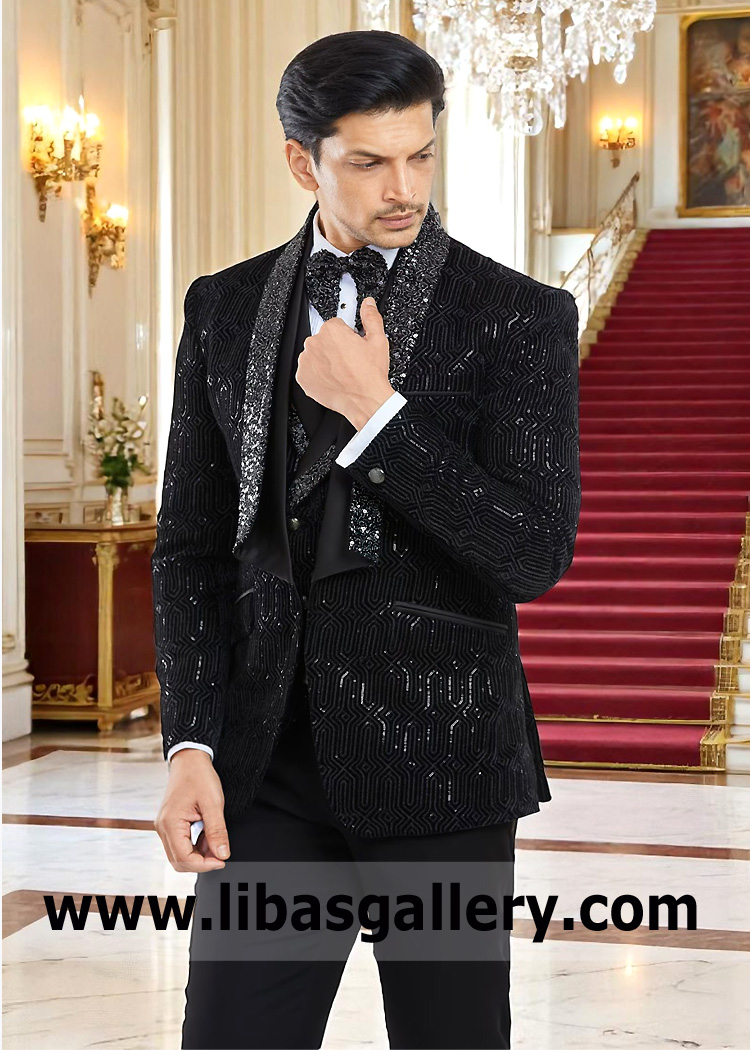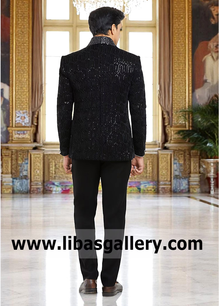 Geometric Embroidered Black Velvet Tuxedo Suit