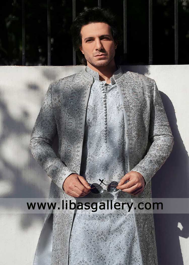 Ice Blue open style Embroidered Wedding Sherwani