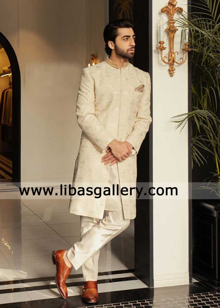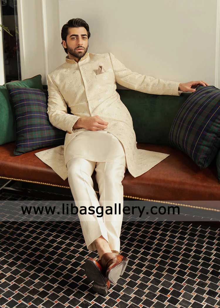 Ivory Embroidered Nikah Sherwani with Gold Embellished Collar