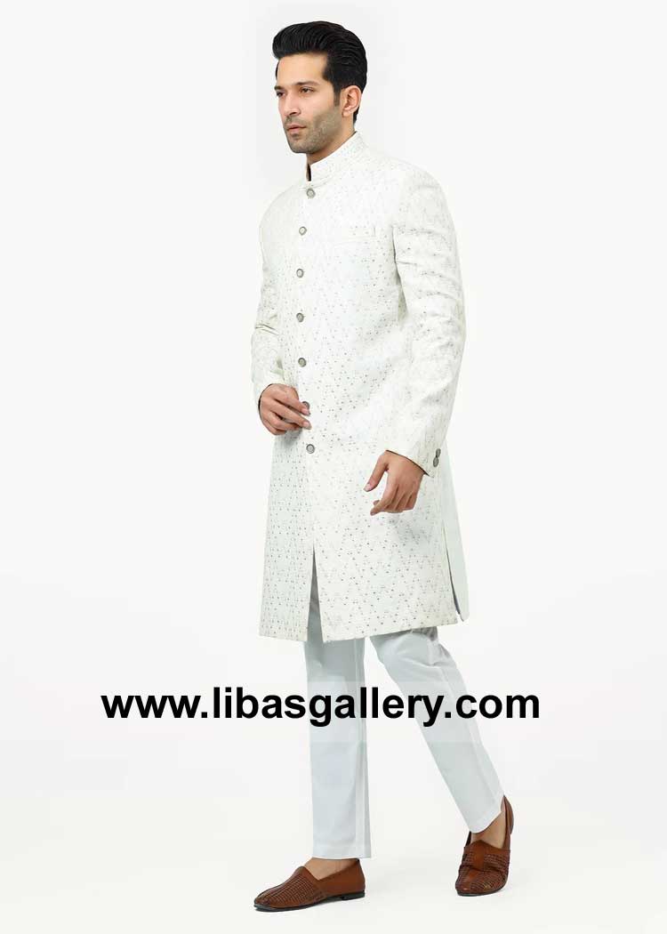 Men Regular Fit White Stylish Sherwani with Velvet piping