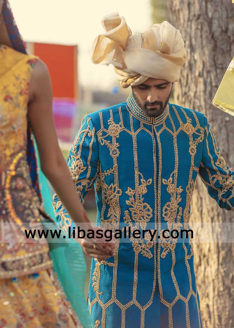 Royal Blue Sherwani with Gold Hand Embellishment