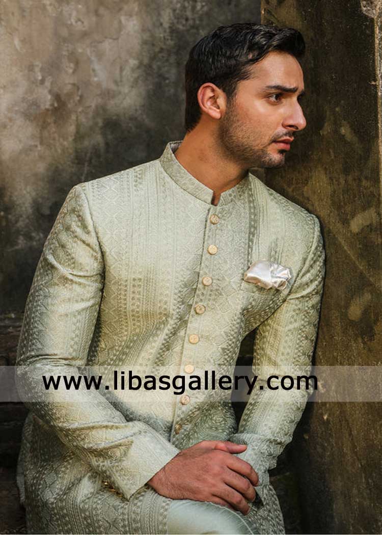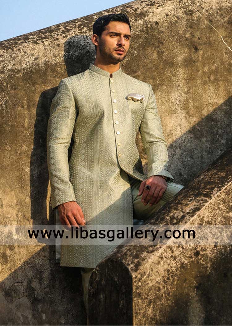 Sage Green Groom Embroidered Wedding Sherwani Style