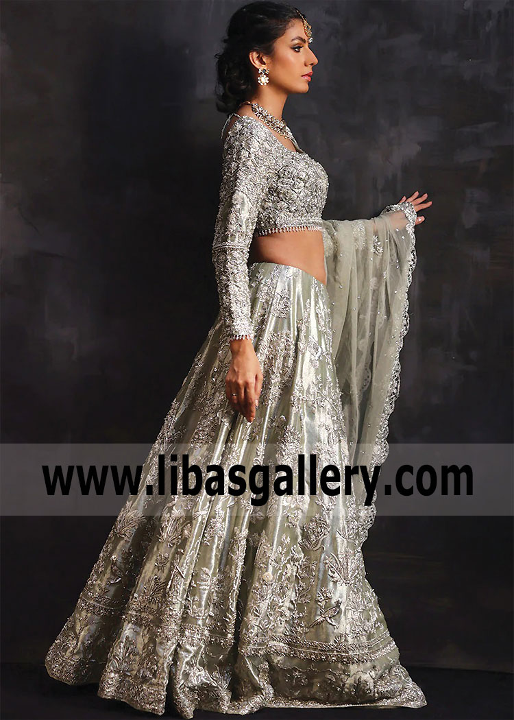 Note: The price of this Bridal dress includes only Light Moss Green tulle color dupatta. Extra charges will apply for the additional Lame dupatta Shawl.