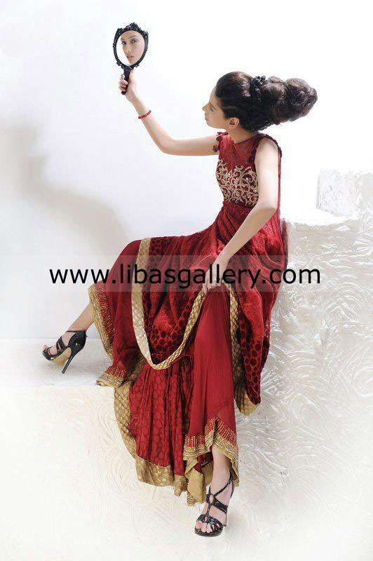 Fitted from the bust and massive flared hems. Finish with antique gold gota lace.