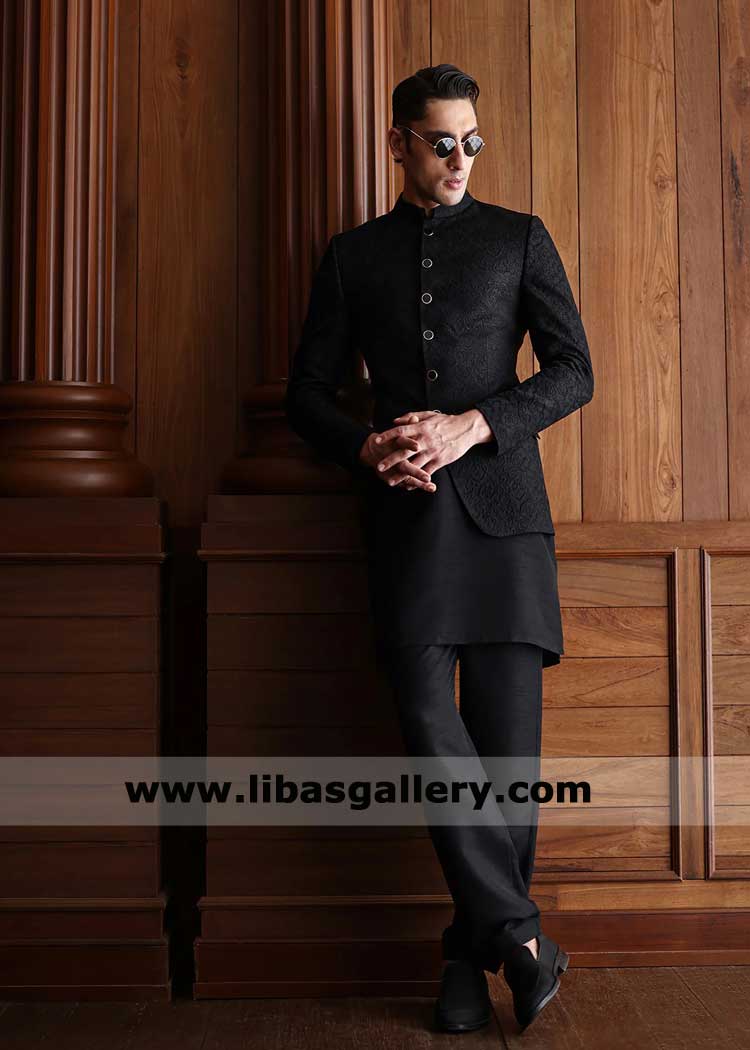 Black Self Embroidered Groom Prince Coat Style