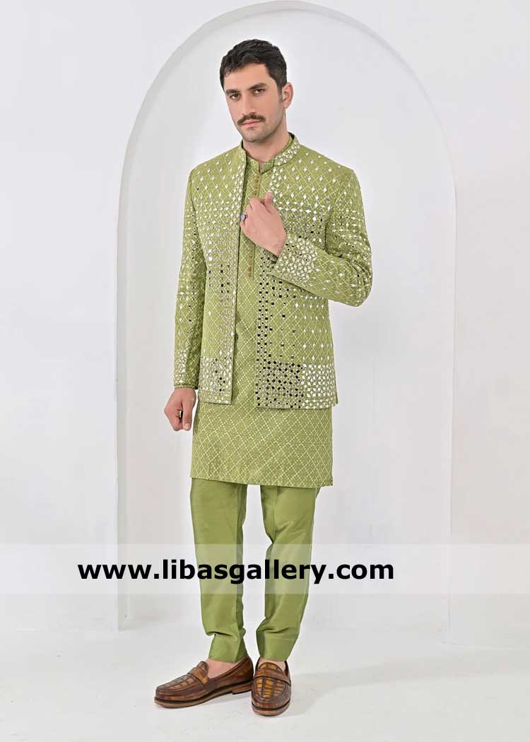 Pista Green Mirror Work Groom Prince Coat